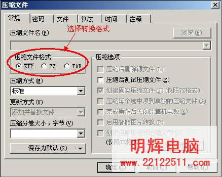 如果要将文件批量转换为7Z或者TAR格式,请单击“压缩”按钮,弹出如图2所示窗口,可以选择转换后的压缩类型是7Z或是TAR,也可设置压缩率和分卷压缩等其他参数。